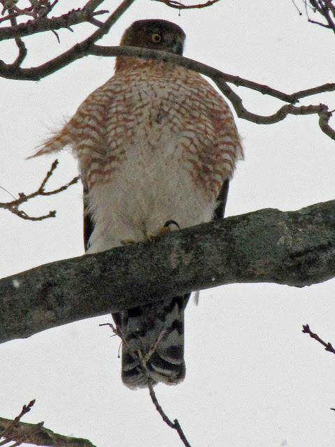 It's a Cooper's Hawk. Take a look at Cornell's Ornithology web site and listen to the birds call. I hope he/she will stick around to help get rid of our vole population.